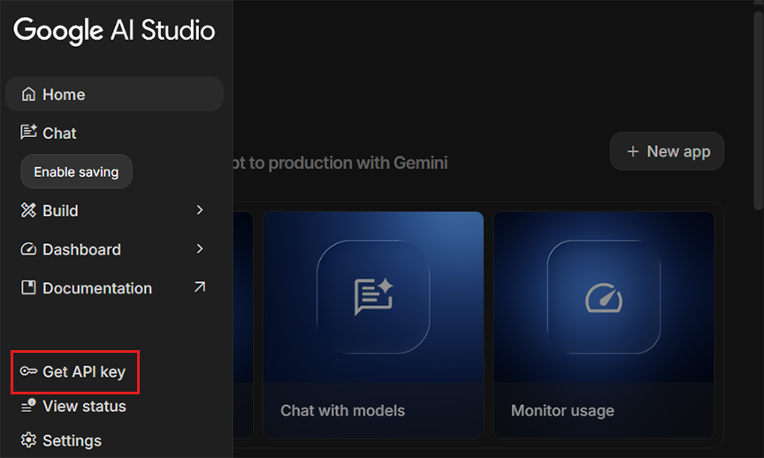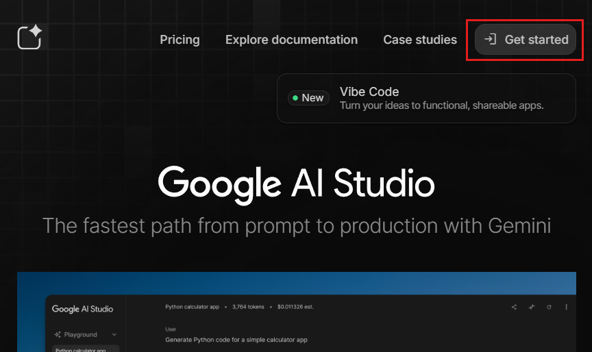 https://aistudio.google.com/welcomeにアクセスし、左上のGet startedボタンをクリック。