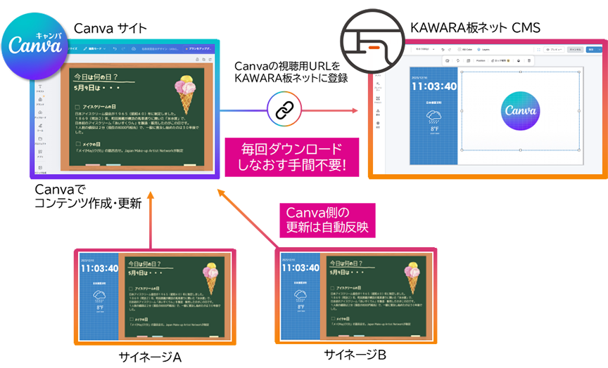 一般的には、Canvaで作成したコンテンツを書き出し(ダウンロード)してからKAWARA板ネットにアップロードする方法がありますが、視聴用URLを登録しておけば、Canva側でコンテンツを更新するだけで、KAWARA板ネットのポーリング周期にあわせて最新の内容が自動的に反映されます。